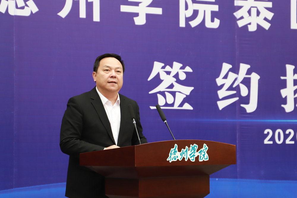 车滨致辞。他首先代表学校向各位来宾表示热烈的欢迎,向德州市委、市政府长期以来对德州学院的支持表示衷心感谢,向共建单位泰山体育产业集团表示真诚敬意。他表示,德州学院是德州的大学,建设现代产业学院,是推进产教融合、协同育人的有效形式,是高等教育服务行业、产业和企业高质量发展的必然要求,是推动地方高校特色发展的重要举措。产业学院成立后,德州学院将在市委、市政府的领导和支持下,着力精准培养应用型人才,着力推进科技创新,发挥人才、技术、平台优势,组建教授、博士服务团,为企业发展“贴身服务”,和共建单位携手,共同实施人才培养培训、共同开展项目攻关、共同建设产教融合研究实习基地、共同培育“双师双能型”师资,共同挖掘和弘扬优秀传统文化,打造集人才培养、技术研发、社会服务、文化传播于一体的特色产业学院,助力健康中国建设,助力德州传统体育产业振兴升级,实现校地、校企共赢发展。他强调,学校将进一步强化以社会和产业需求为导向,建设更多对接德州市产业链的应用型专业群,搭建更多产学研合作平台,培养更多社会和产业急需的应用型人才,着力建设有理想、有情怀、有德性、接地气的高水平应用型大学建设,努力为建设新时代现代化新德州做出更大贡献。