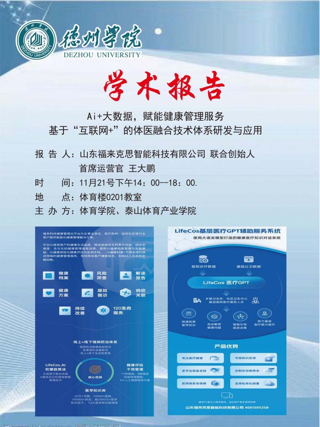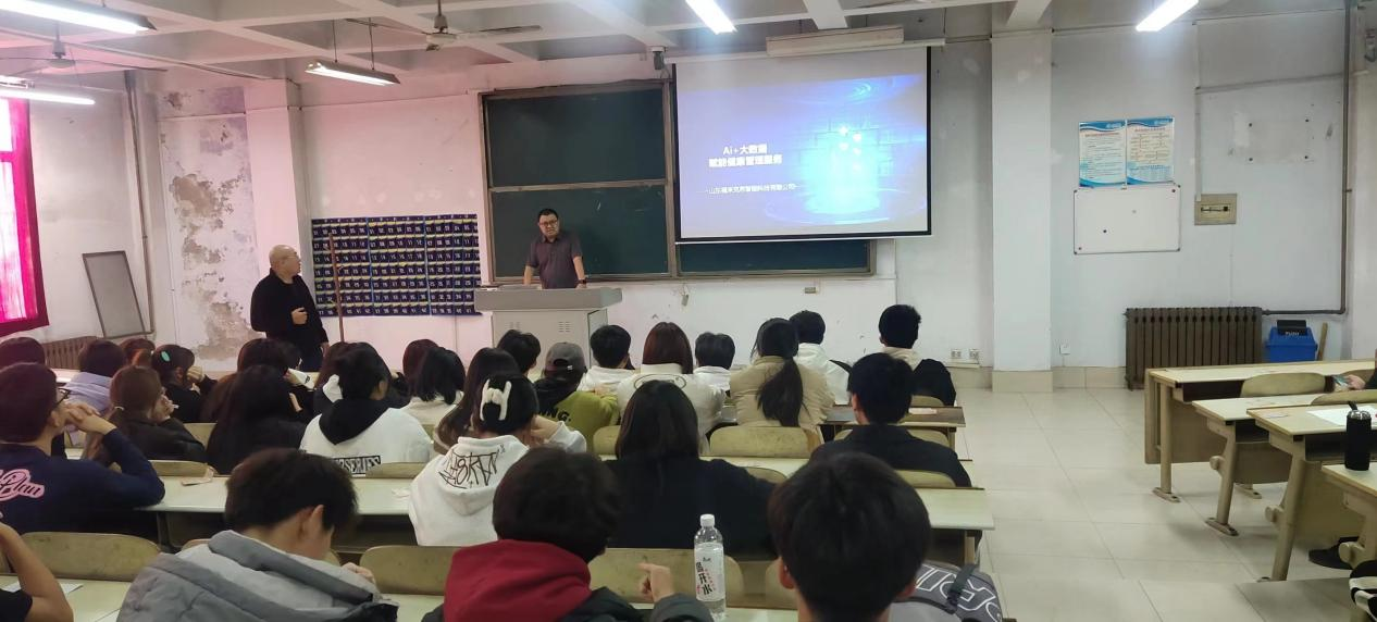2023年11月21日下午,山东福来克思智能科技有限公司联合创始人首席运营官王大鹏做了“Ai+大数据,赋能健康管理服务——基于‘互联网+’的医体融合技术体系研发与应用”的报告,体育产业科技班同学、医药与护理专业同学及部分教师60余人聆听了本次报告。王大鹏为同学们介绍了山东福来克思智能科技有限公司目前涉足的医体融合“互联网+”相关项目及医体融合“互联网+”项目的发展前景及市场价值。